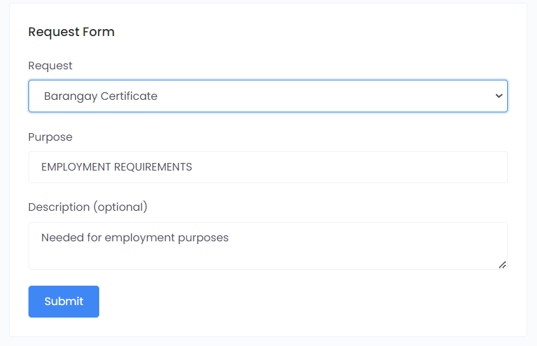 Fill in the forms and select the requested document of your barangay