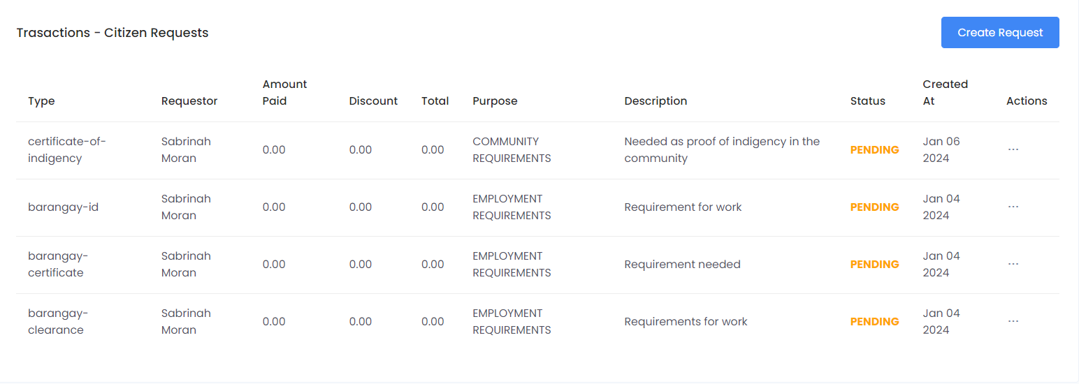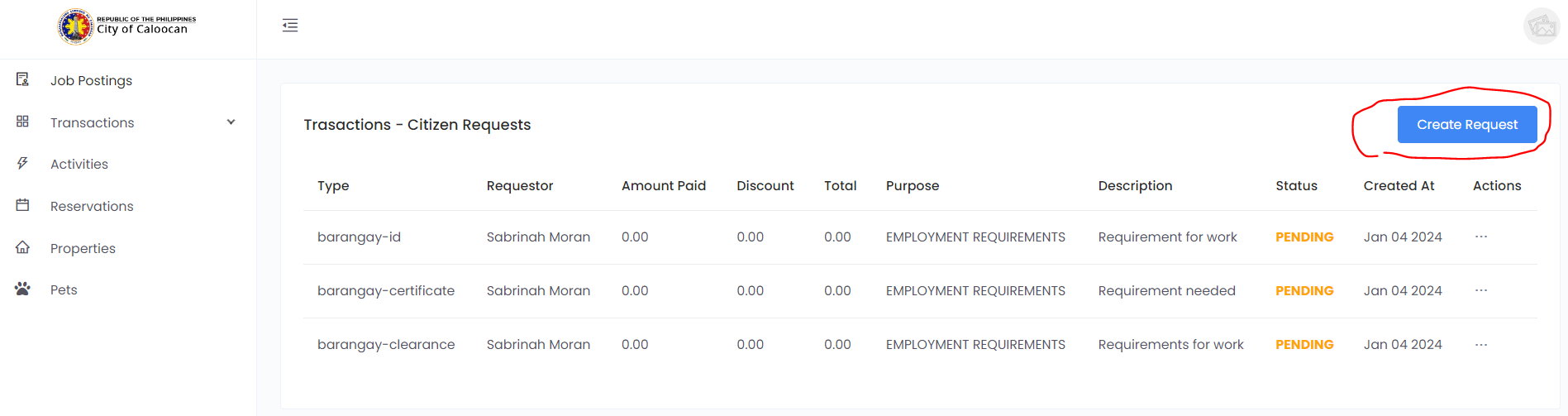 Go to the Transactions and select Citizen Requests and click the Create Request button